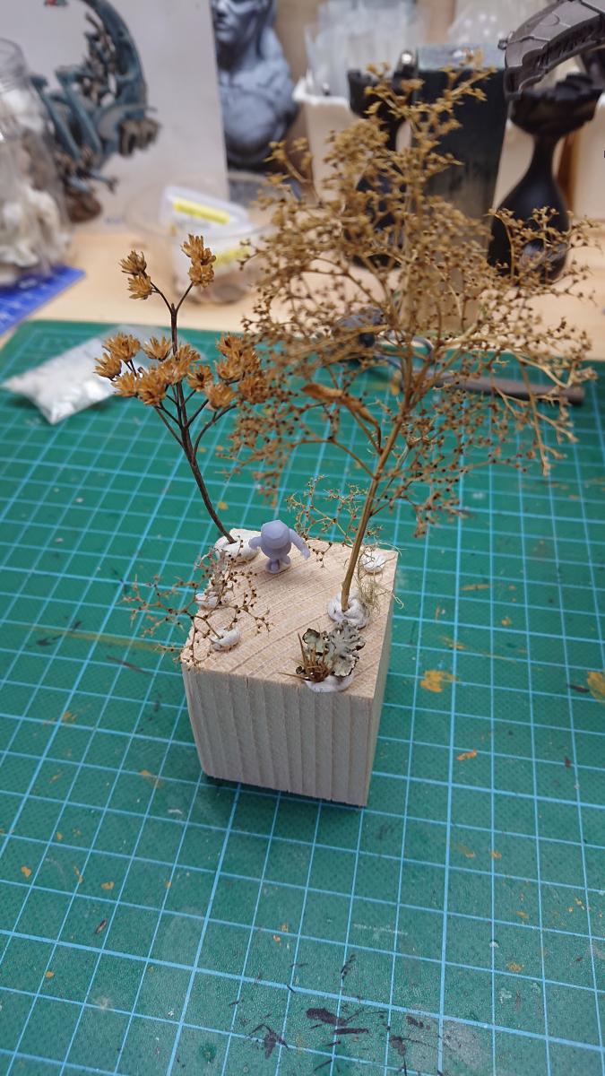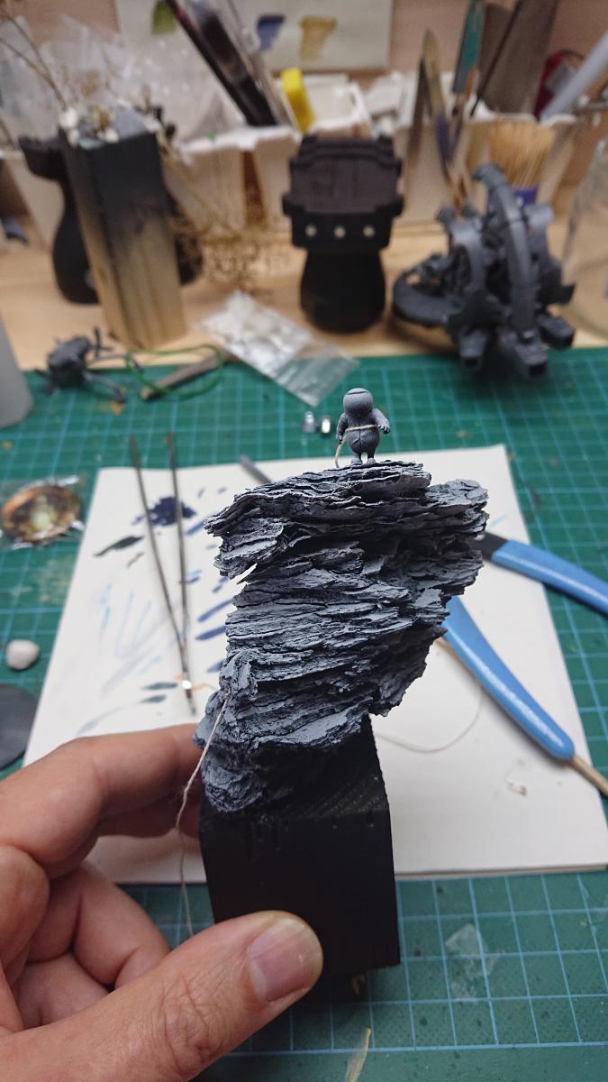 Da ich gerade meine ganzen Schneebasesachen bekommen habe, war ich versucht das Ganze im Schnee stattfinden zu lassen. Passt eh gut zu Russland und gefiel mir. Also einmal die FIguren aufgeklebt und den Bodenbelag aufgetragen. Der kleine Yuri steht dabei auf einem Korkfelsen: