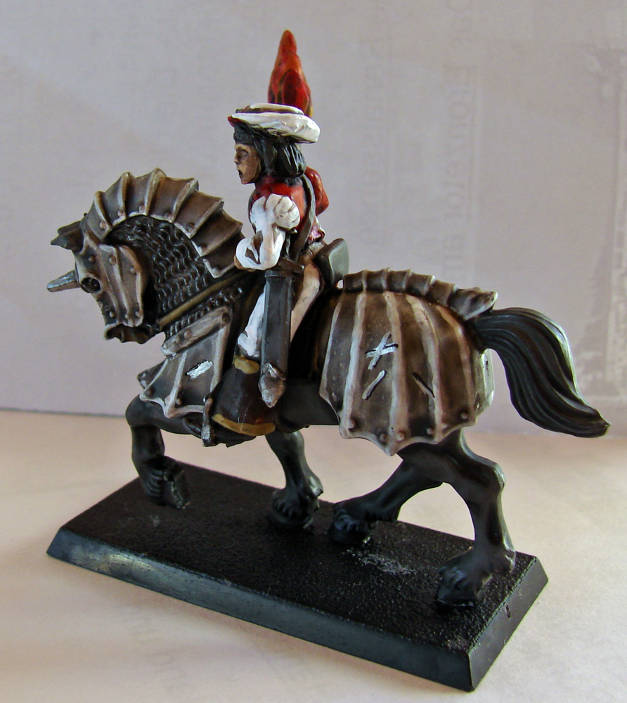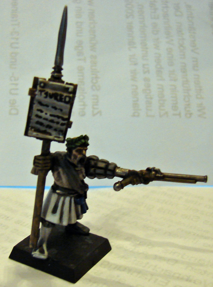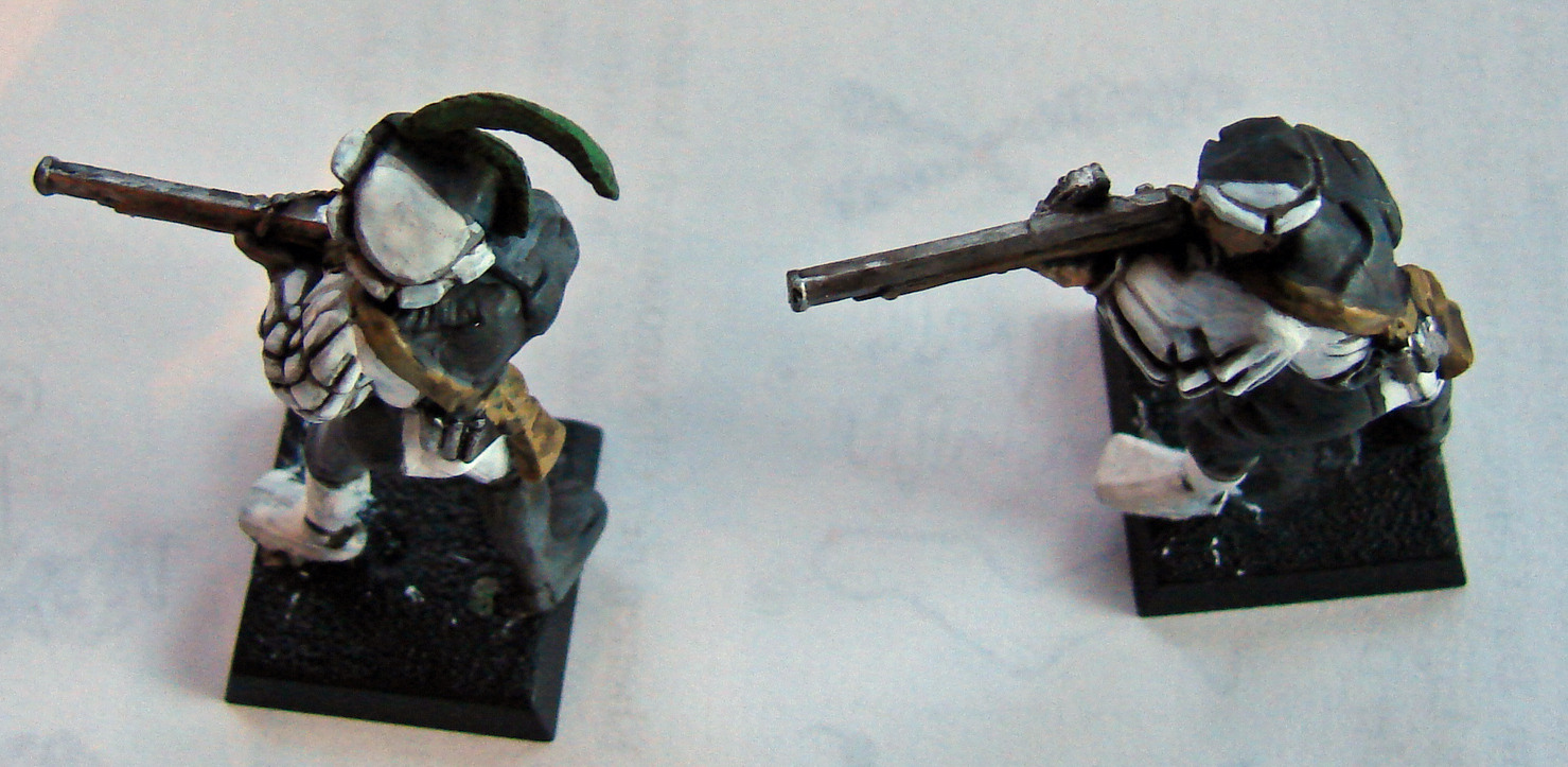 Die Arkebusiere sind ganz normale Musketenschützen aus der alten Grundbox. Also noch nichts besonderes. Auch von der bemalung nicht (hängt davon ab, dass die schon mal bemalt waren. (und zwar ziemlich hässlich) Sie tragen einen Teil der Ordensfarben des Ritterordens vom Aschebaum, der Weiß mit einer Heraldik eines Schwarzen Eichenbaumes trägt.