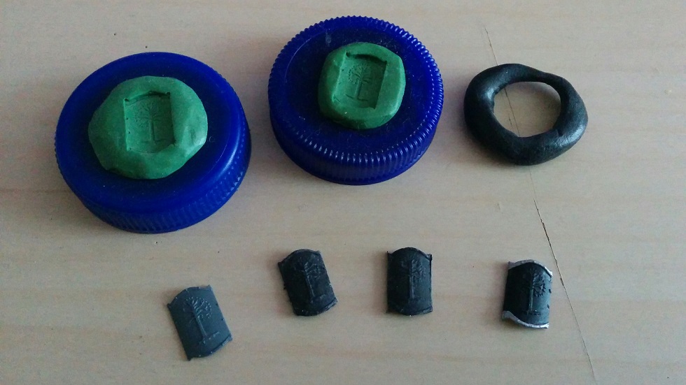 Die Formen mach ich aus Green Stuff und die Schilde selbst sind aus Compound 9 (das Schwarze), das lasst sich wenn es erhitzt ist verformen und wird dann innerhalb ca. einer Minute wieder fest, ist also feiner als Green Stuff für die Massenproduktion.