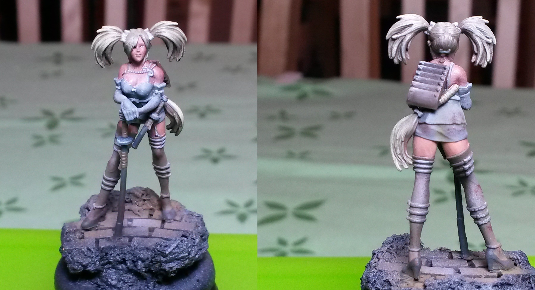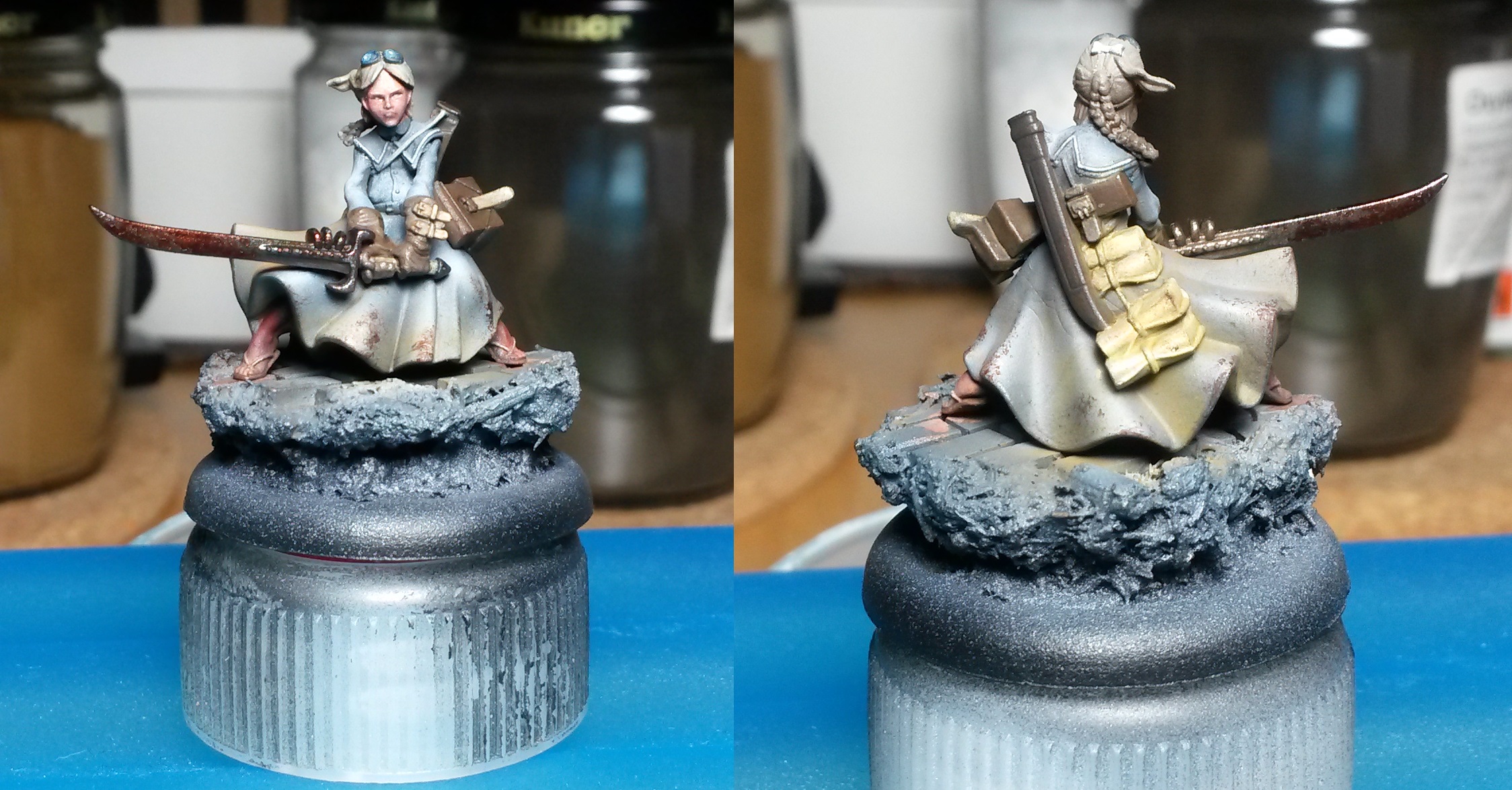 Die sind bewusst so gehalten, bei der kommts jetzt noch unbunter rüber, da sie kein Blutgesplatter drauf hat. Ich habs bereits mit bunt bzw nur bunten Akzenten bereits probiert, und beide male hatte es bei den Malifaux Minis zur Folge, dass sie mir nimmer gefallen haben. Deshalb ganz bewusst nur erdige und graue Töne.