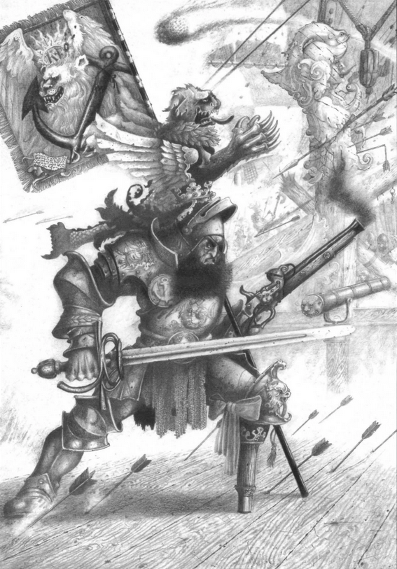 Am zweiten Tag wurden wir von aufgeregtem Geschrei aus der Ferne geweckt, welches wir in den Ruinen auszumachen glaubten. Schnell trieb ich meine Seeratten zusammen und befahl die Pistolen zu laden. Da ich nicht wieder, wie am Tag zuvor, in einen Hinterhalt geraten wollte, gab zwei meiner Männer ein Zeichen sich aus der Deckung einer Ruine zu wagen und die Lage zu sondieren. Dass die zwei Männer jene waren, die am Tag zuvor, klamm vor Angst, gezögert hatten ihren armen Kameraden zu decken, war natürlich kein Zufall. Diese Feiglinge sollten nun einmal mehr beweisen, dass noch ehrliches Piratenblut durch ihre Wehnen floss. Kaum hatten die Männer die Deckung verlassen surrte etwas in der Luft und traf den armen Hans mit voller Wucht, was ihn zu Boden gehen ließ. Sein Kamerad, der den Beschuss gar nicht mitbekommen hatte rief nur laut aus er habe Feindkontakt und man möge ihn unterstützen. Mit gezückten Pistolen verließen wir unsere sichere Deckung und erspähten in der Nähe zwei kleinwüchsige, muskulöse Gestalten die auf unsere Kameraden zustürmten. Tätowierte rotbärtige Zwergenslayer waren es die ihren Spaß im Nahkampf suchten, wohl gedeckt von einem Scharfschützen der dort hinten irgendwo erhöht in den Ruinen nach neuen Zielen Ausschau hielt. Feuer brüllte ich und Schwarzpulvernebel verhüllte die Umgebung. Sehr zu unserem Leidwesen traf keines der Kugeln unsere Angreifer, sogar Karl Kuttlach, der so volltrefflich den Rattenmenschen erlegt hatte feuerte ins Nicht. Der am Boden liegende Hans wurde verfehlt und kam torkeln wieder auf die Beine. Mit letzter Kraft schlug er dem Angreifer die Axt aus den Händen. Dafür wurde der Quartiermeister zu Boden geschickt und konnte sich nur mit Mühe den Hieben, die auf ihn einprasselten erwehren. Bei allen Göttern rief ich aus – wir ziehen uns zurück! Die Slayer ließen sodann ab und grunzten nur verächtlich als meine Mannschaft davonstürmte. Sie würden ihren Kampf auf Leben und Tod schon noch bekommen- in dieser verfluchten Stadt konnte man auf tausende verschiedene Art und Weise verrecken.