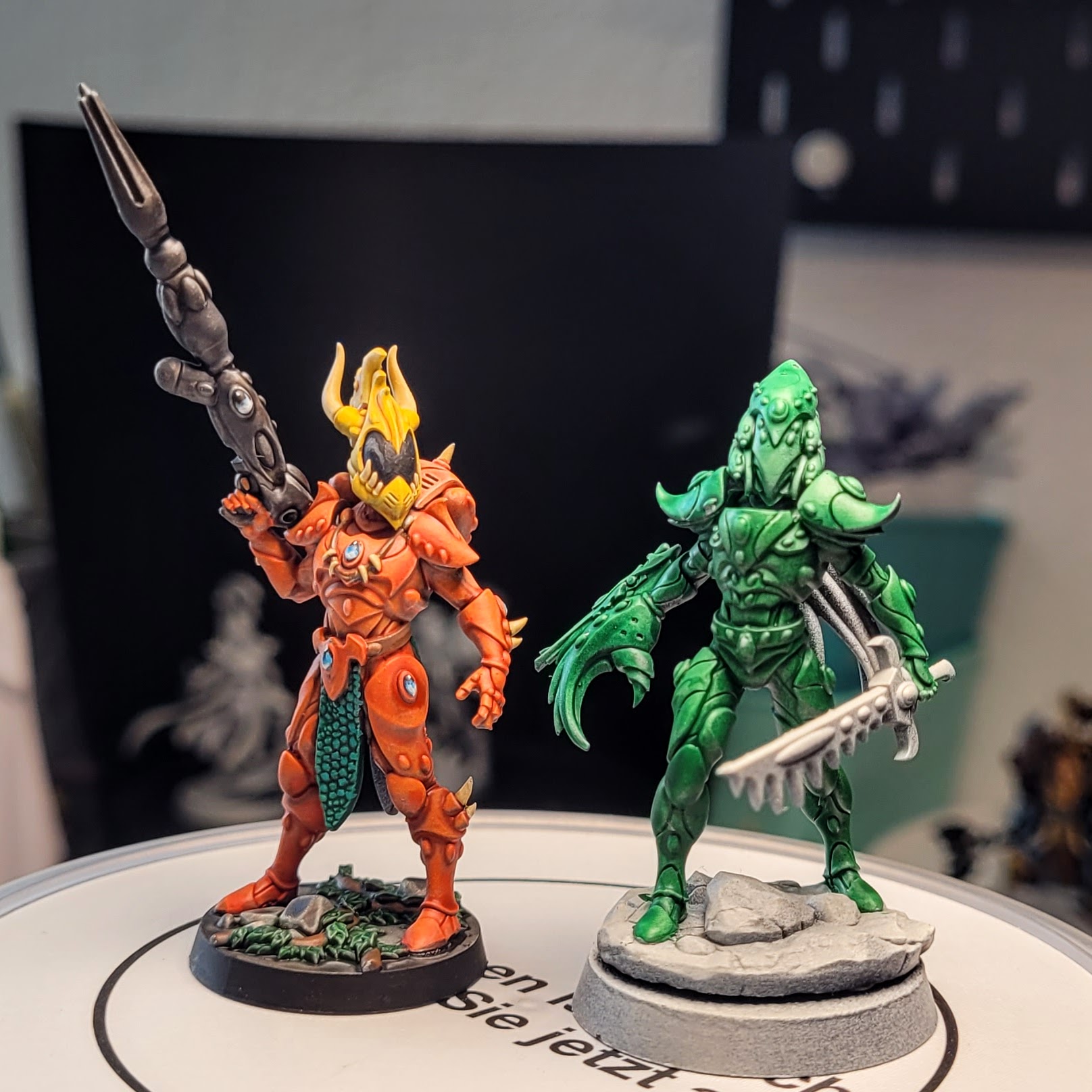 Die Testmodelle schauen auf jeden Fall sehr gut aus. Vor allem das Detail mit dem Hochglanzhelm sticht extrem gut hervor. Wirkt sogar im Hintergrund von dem Warpspider Modell noch als Hingucker.