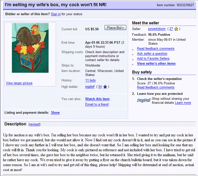 Stellt hier Fotos von Dingen rein, die bei ebay (oder einem anderen Auktionshaus) stehen und rausgeschmissen wurden oder gelöscht werden solten.