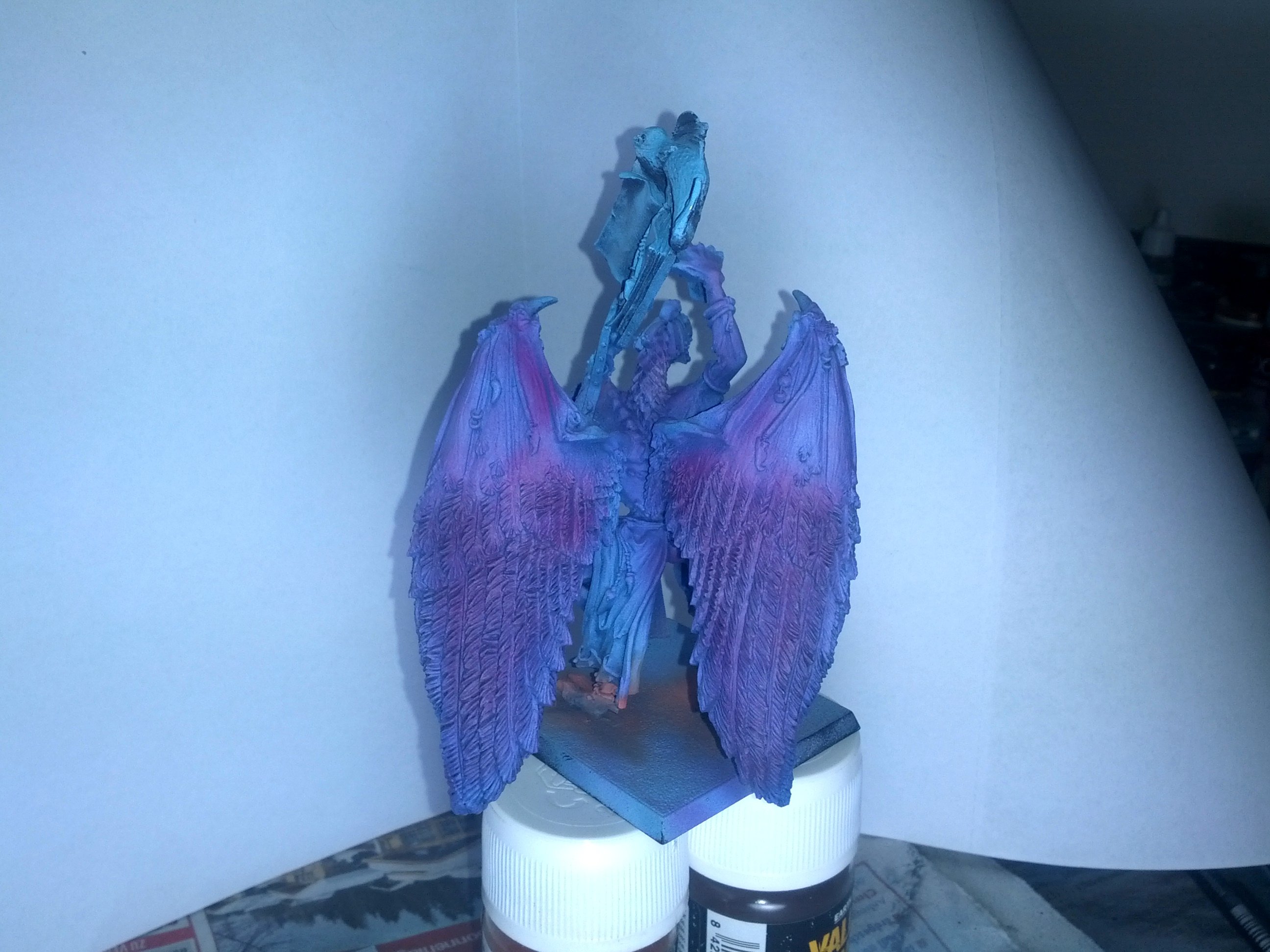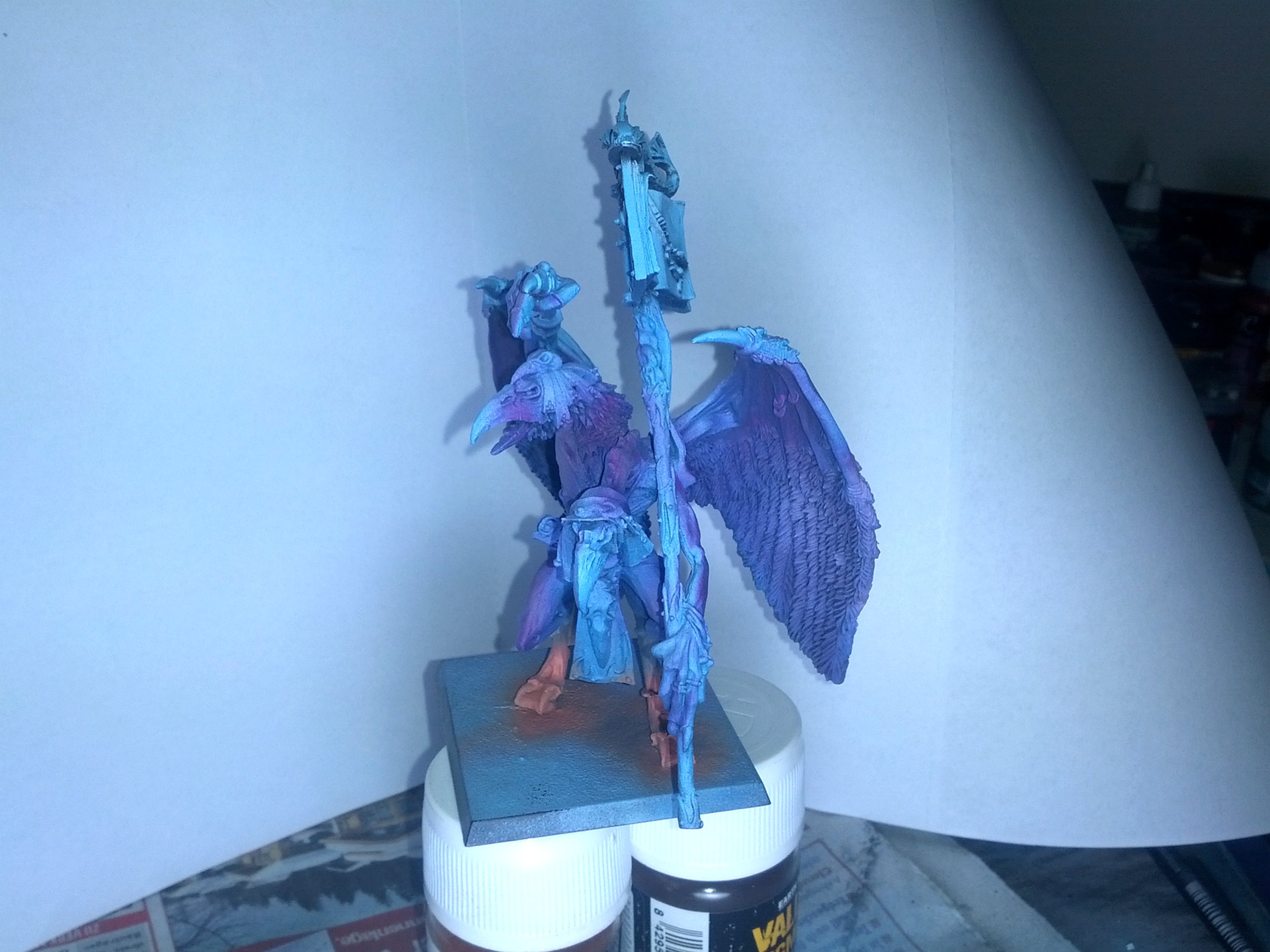 Deshalb! habe ich das Modell gestern trocken gefönt und habe weitergemacht Flügel herller Bürsten, damit die Federn rauskommen und danach mit stark verdünntem Schwarz gewashed. So stark verdünnt, dass es das Modell nur Minimal abdunkelt aber dort wo es zusammenläuft eine Sichtbar dunklere Stelle bildet.