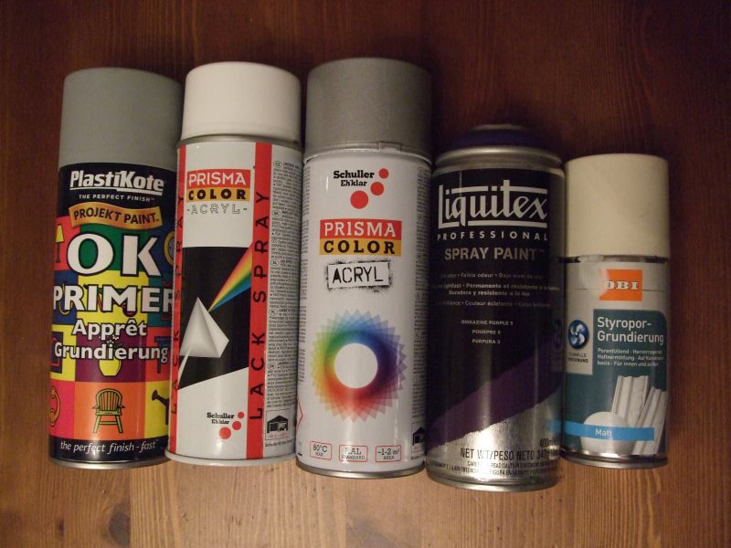 - Sprühfarben (Grundierung noch mindestens halb voll, Weiss noch 10-20%, Silber ~50%, Lila von Liquitex min 50% kein Cap, Styro Grund ~50%).