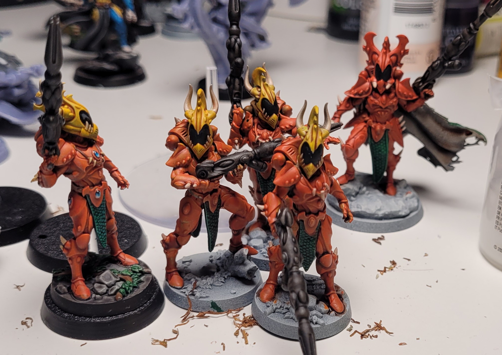Ich überlege, die Aspektkrieger in ihren klassischen Farben zu bemalen – also Orange für die Fire Dragons und Rot/Schwarz für die Warpspiders, usw.