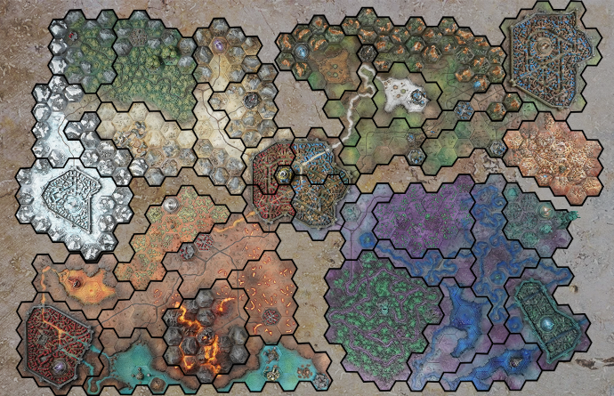 Eine Einteilung der Hexfelder in Gebiete würde Spielern es ermöglichen, begrenzten direkten Einfluss auf die Karte zu nehmen (Wenn Spieler das Gebiet beim Melden des Resultats nennen, würde ein Hexfeld im jew. Gebietes den Besitzer wechseln; wenn kein Gebiet genannt wird, entscheiden die Organisatoren) Außerdem könnten Gebieten Eigenschaften zugewiesen werden, welche - optional - Einfluss auf in ihnen stattfindenden Spielen haben könnten (z. B. mindestens zwei Wälder aufstellen). |