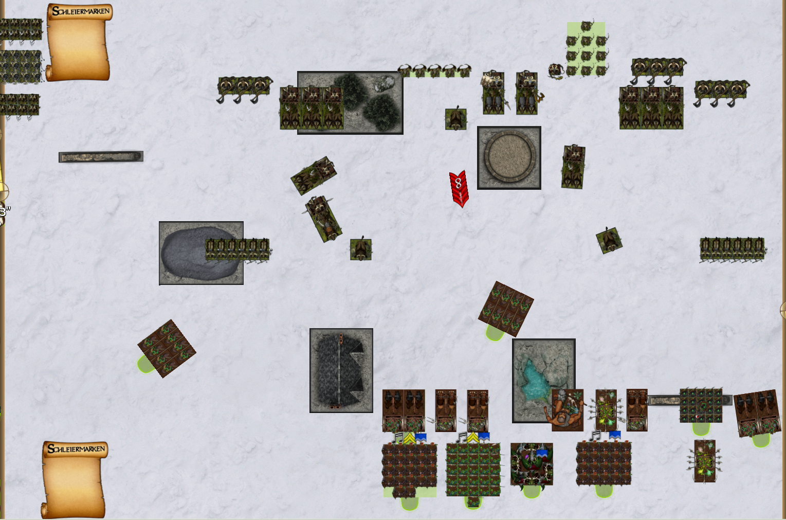 Ich droppe und lasse den pro mit 5/6 Wahrscheinlichkeit beginnen was er auch tut. Er stellt gleich Einheiten in die Flanke meiner Aufstellung