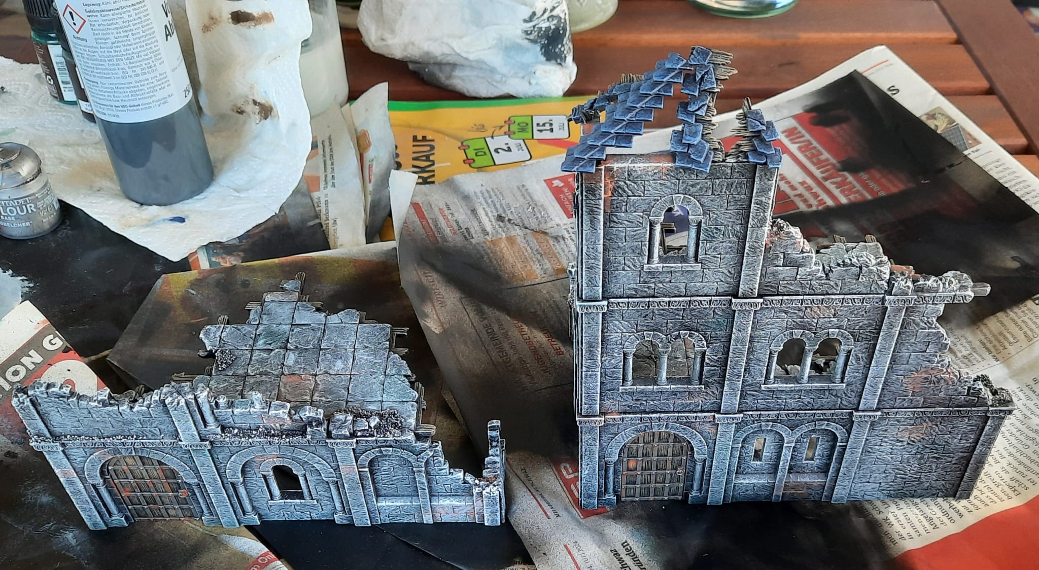 Bei mir zuhause ist noch eine große Ruine 40k, ein mittleres Industriegeländestück zum ausbessern sowie das frische Fantasygeländestück.
