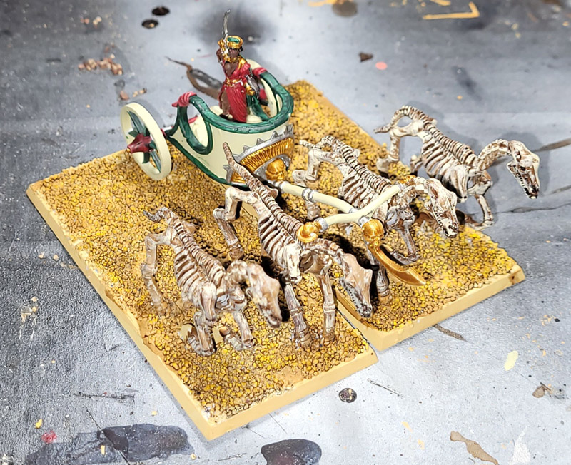 Da es Menschen gibt, die ein Modell von Lord Settra auf seinem von vier Pferden gezogenen Streitwagen haben, hat es die Option ins T9A-Armeebuch geschafft.