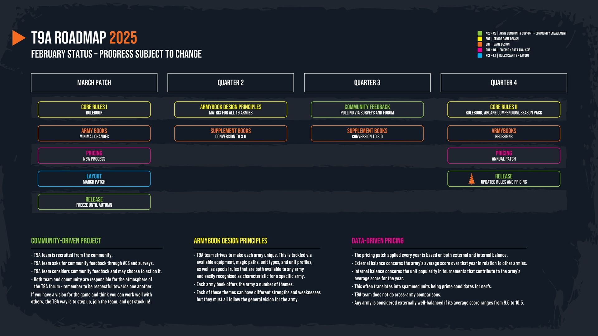 Alongside them, work will begin on the Army book Design Principles. A comprehensive document featuring guidelines for the armies in the game, that better showcase their themes, and where their specialties lie, to help guide designers in the future as different designers and task teams take the reins of a given army book.