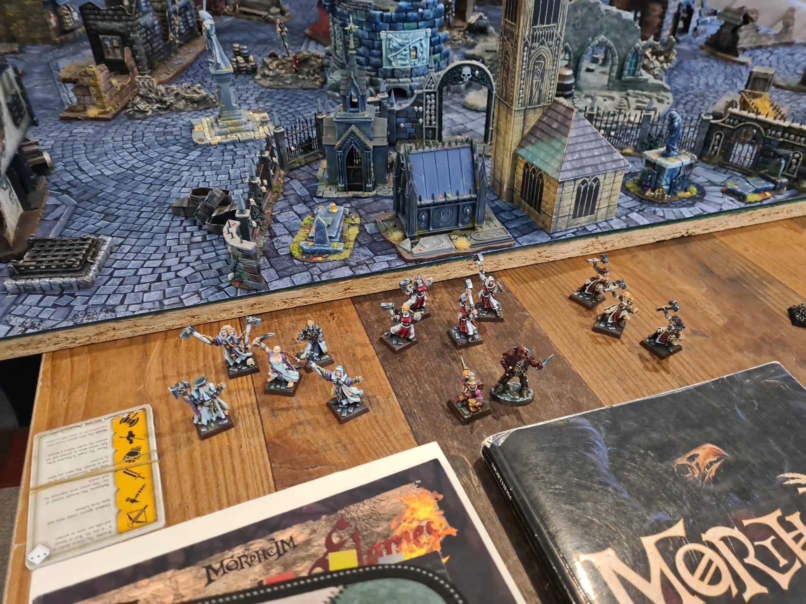 Ich durfte auf dem Tisch mit dem großen Geländestück spielen, deshalb habe ich da auch etwas Morrstein hingelegt. Crusader hat die Seite mit der Kathedrale erhalten und sich da teilweise auch auf dem Dach platziert. Ich bin nach vorne gegangen und habe einige Todeswölfe ausgeschaltet, die zu meinen Warpsteinen gerannt sind.