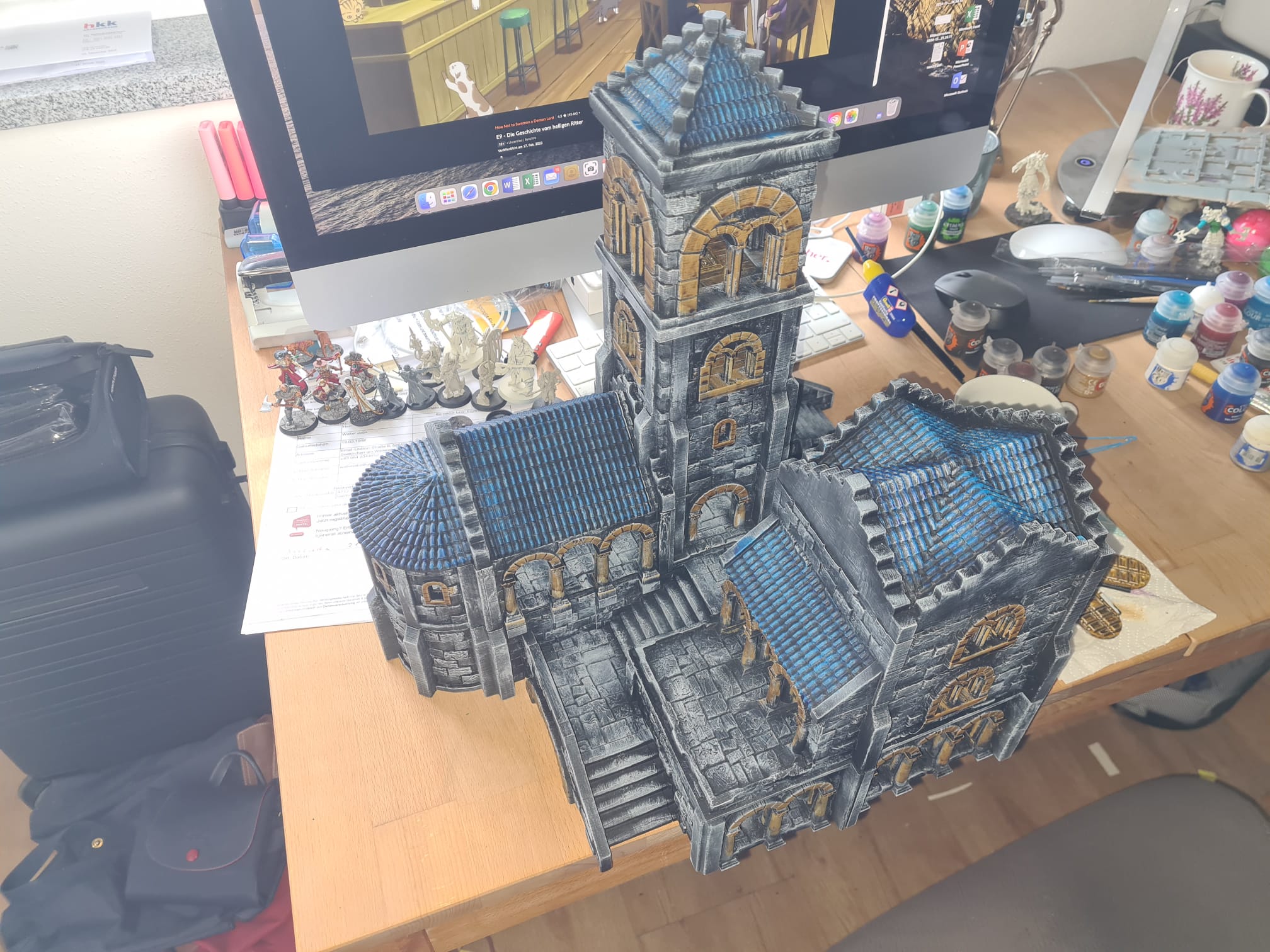 Wie spielen auf der Platte mit der großen Kathedrale. Er liegt die Mortstein Splitter einmal ins offene Gelände und einen aufs Dach der Kathedrale ich lege einen auf einen zwischenstufe und einen recht nah am Spielfeld Rand
