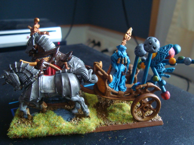 Wenn ich ehrlich bin, gefällt mir das original besser, aber dein Gestell am Wagenende hat auch was. Die Stäbe sind zwar schon ziemlich dick, aber anders würde es wohl nicht halten? Die Greenstuffknödel sind auch nicht alle ganz rund, aber das sind die Planeten ja auch in Wahrheit nicht, von daher weiß der Himmelsmagier nur mehr bescheid