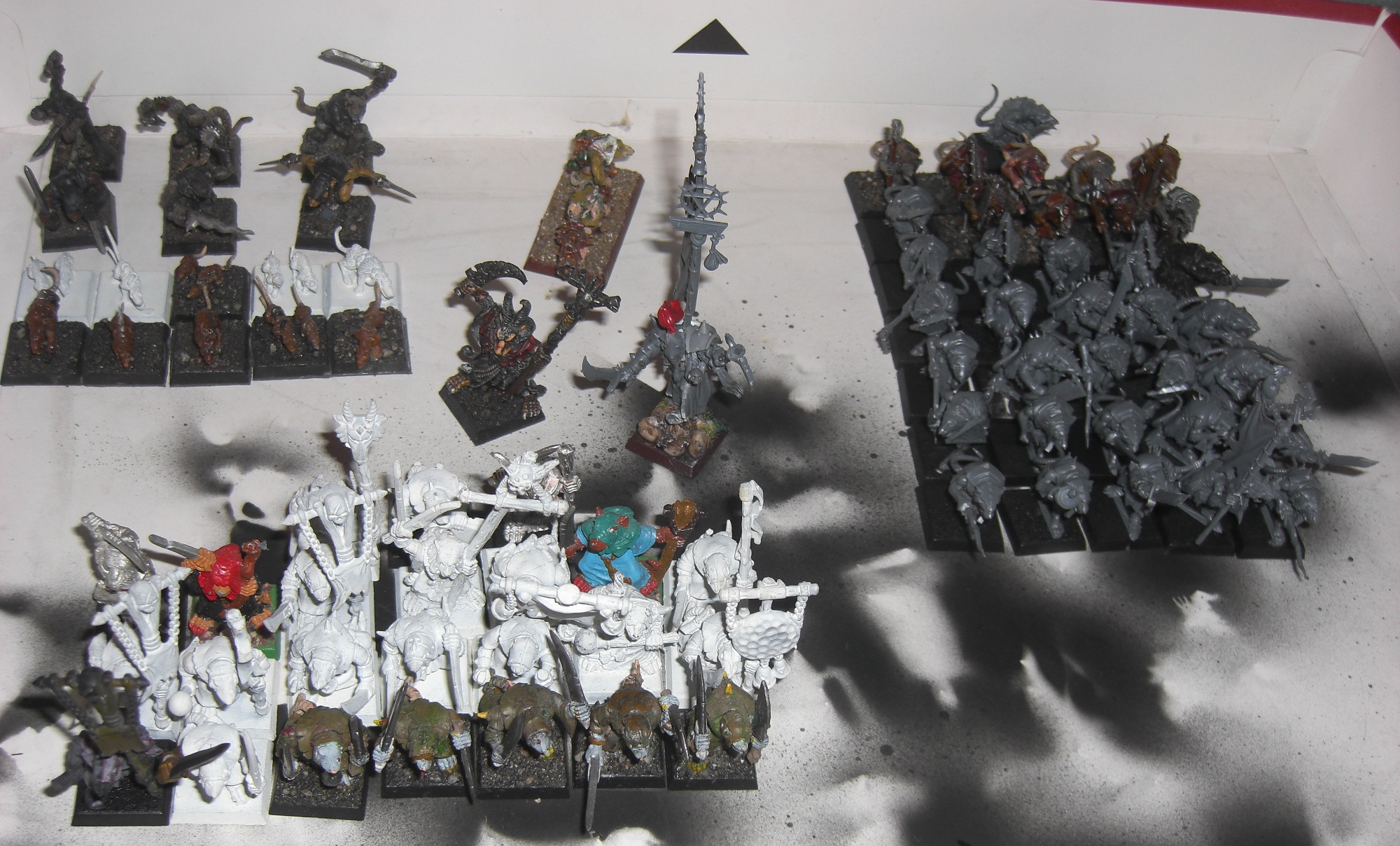 Im Ernst jetzt: die mit dunkler Basegestaltung sind natürlich die Vorlagen. Richtiges Armeeschema wird es nicht geben, jede Ratte, was sie in ihre dreckigen Pfoten bekommt.