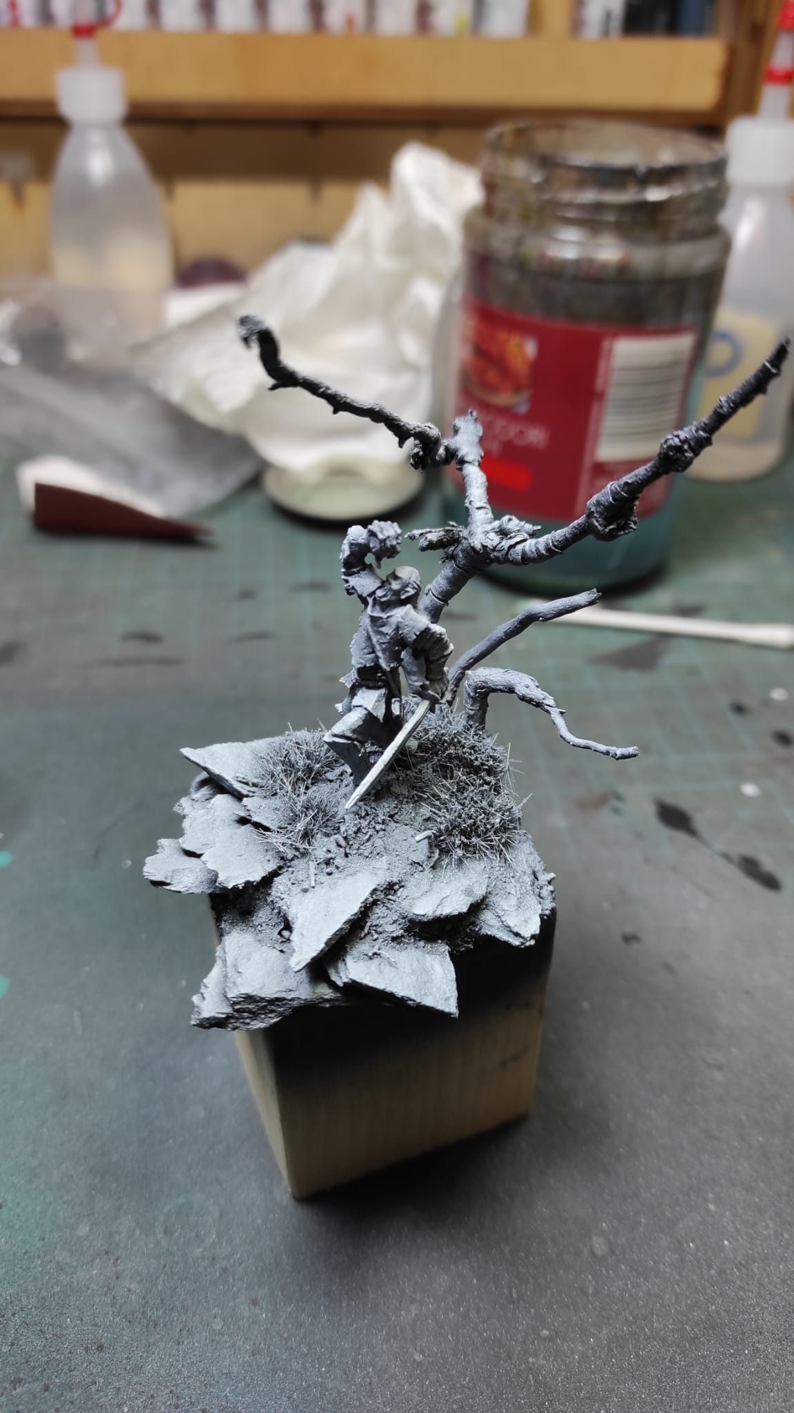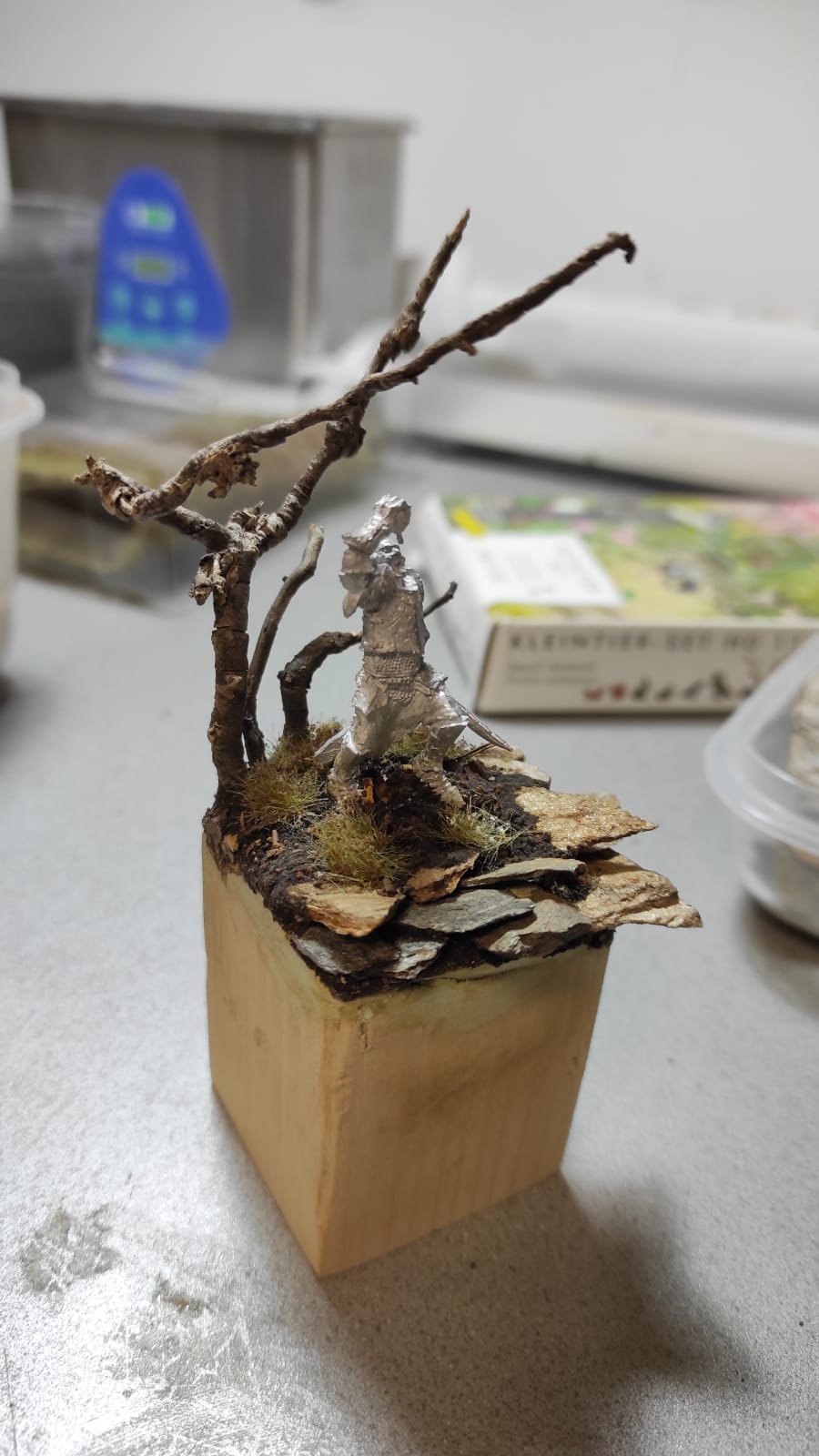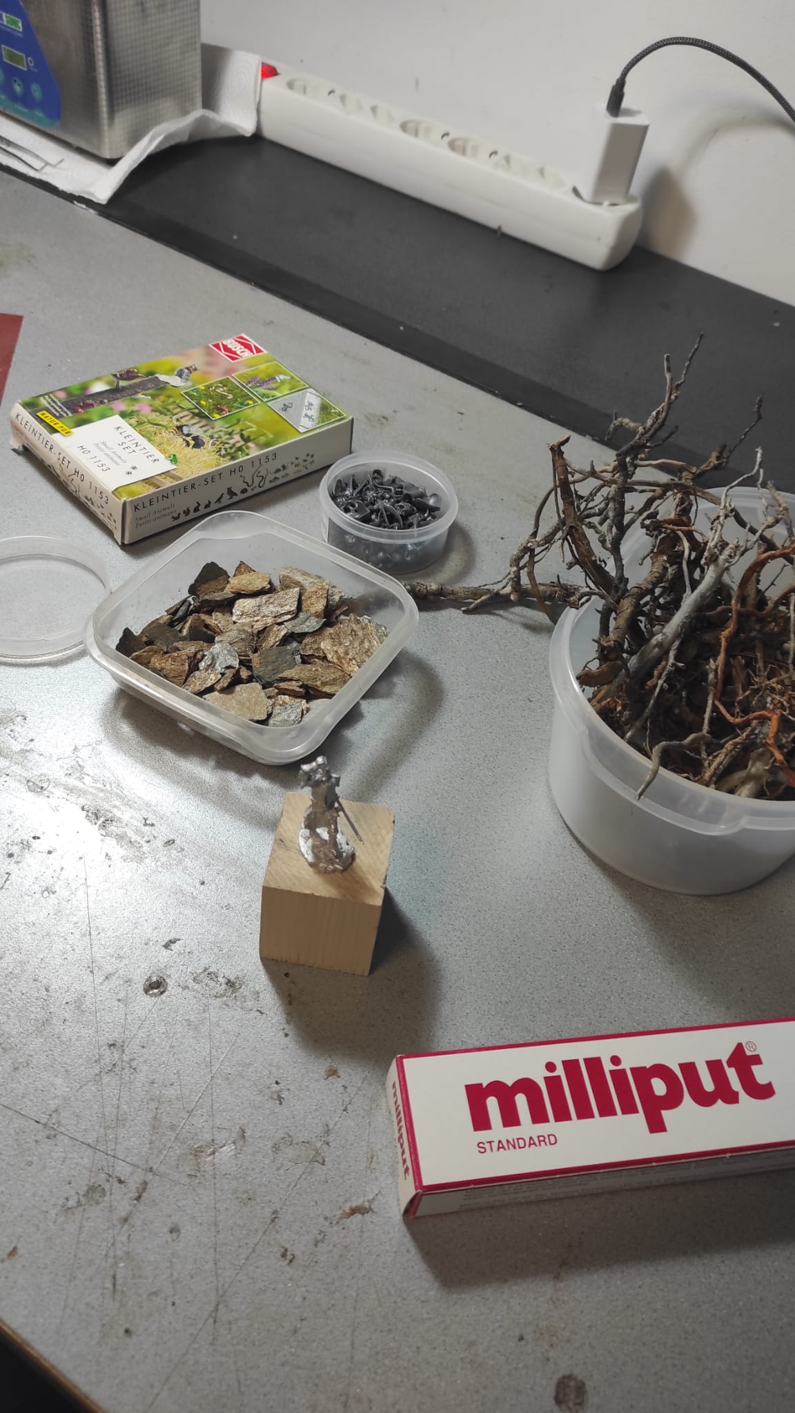 Auf die Base kam dann ein klumpen Miliput in den ich einfach ein paar Schieferplättchen und den Baum gesteckt habe bis es mir gefallen hat