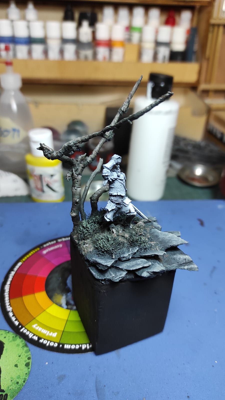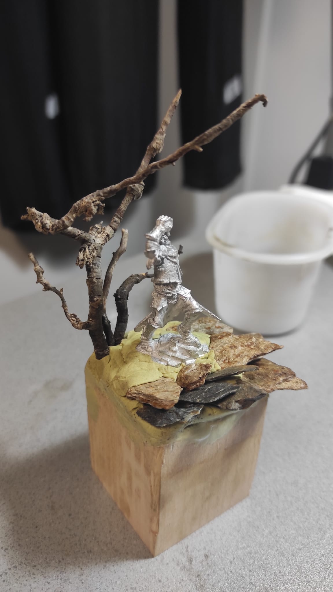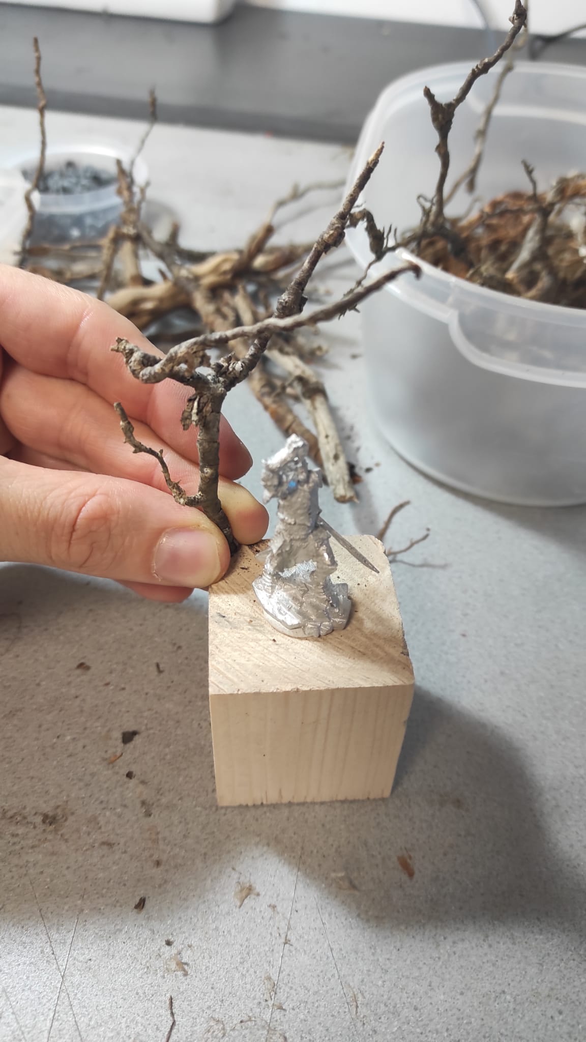 Auf die Base kam dann ein klumpen Miliput in den ich einfach ein paar Schieferplättchen und den Baum gesteckt habe bis es mir gefallen hat