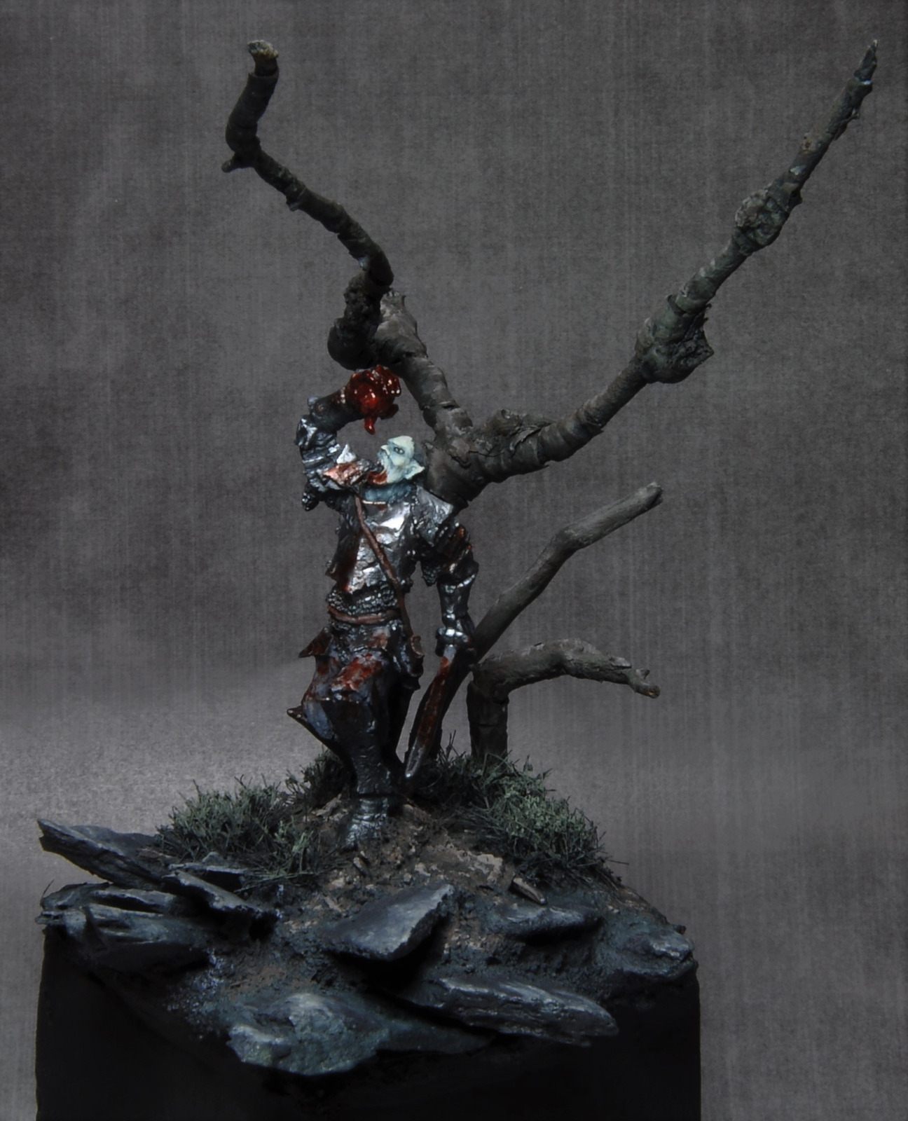 Als ersten Bemalungschritt kam dann die Base dran, die für die Mini hab ich mir vorgestellt, dass der Fürst nach einer nächtlichen Schlacht gerade das Herz des gegnerischen Generals verspeist und damit die Schlacht entschieden ist - Die ganze Szene würde also eher dunkel werden - Ausschließlich erhellt von Mondlicht