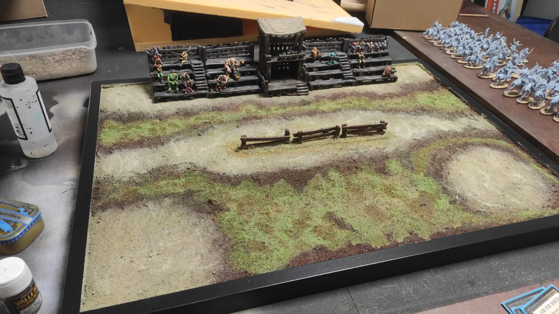 Joa das Fantasy Gelände hab hauptsächlich ich vor allem die Kartonhäuser und jede Menge Hügel...