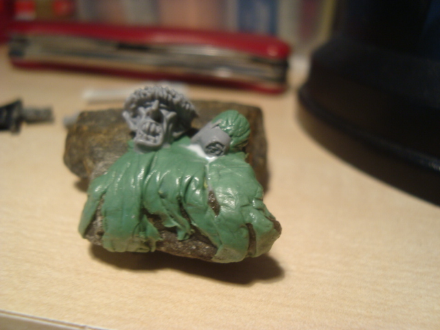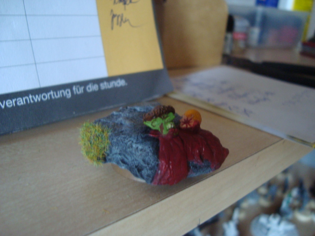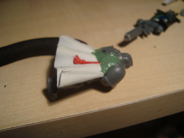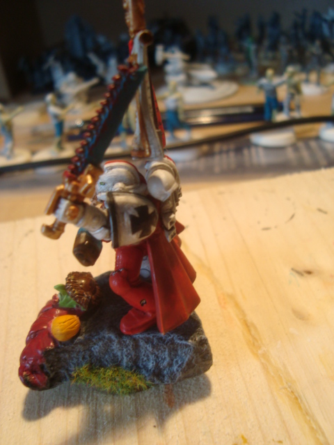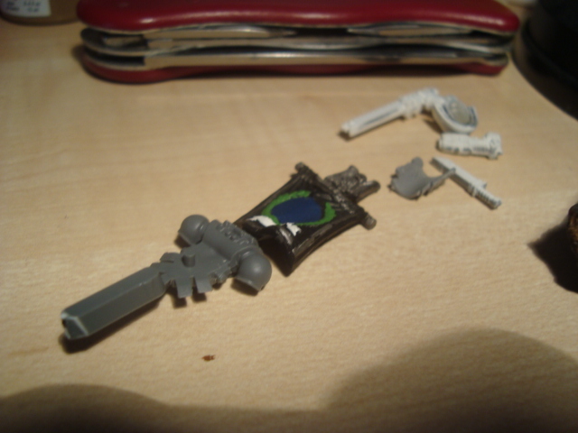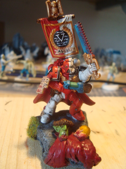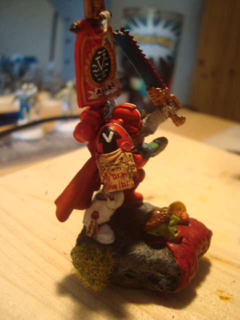 Als ich zu Hause den Marine ansah, dachte ich mir...ne, der ist zu langweilig. Ein Hundsnormaler Black Reach Space Marine, fast aus einem Guss...da muss man mehr geben! Also hab ich mich mal ans Umbauen gemacht. EIn abgeknipster Mantel eines Captains, der mit Green Stuff drangepappt wurde und ein Banner eines Seargents sollten die Figur aufpeppen. Der linke Arm wurde abgeschnitten und durch einen mit Kettenschwert ersetzt. Bolter durch Plasmapistole. Dann noch hie und da ein Einschussloch gebohrt und eine kleine Pergamentrolle am Schulterpanzer. ZUsammengebaut und grundiert ist er, jetzt gehts ans Malen! Das Base ist obligatorisch ein Steinchen mit einigen blutigen Trophäen *hust* Goblins und Chaosanbeter sind einfach dazu da abgeschlachtet zu werden