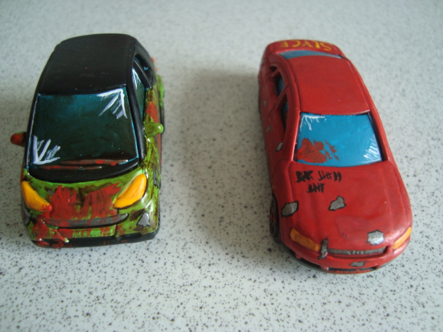 Und hier einmal das erste Bild eines der Autos. Ich habe hier, da die Farbe wirklich perfekt getroffen wurde, den Wagen so gelassen und nicht grundiert, die Washes haben also nicht ganz funktioniert..aber er gefällt mir trotzdem Smile Die nächsten beiden, die in Arbeit sein werden, sind weiß sprühgrundiert worden, wie ihr seht.