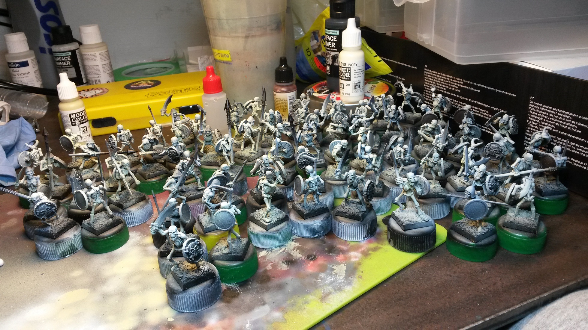 Schnelles WIP vom aktuellen Stand der Dinge: 24 Zombies und ~80 Skelette Zombies neu gebased, über-grundiert& Grundfarben